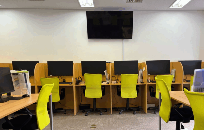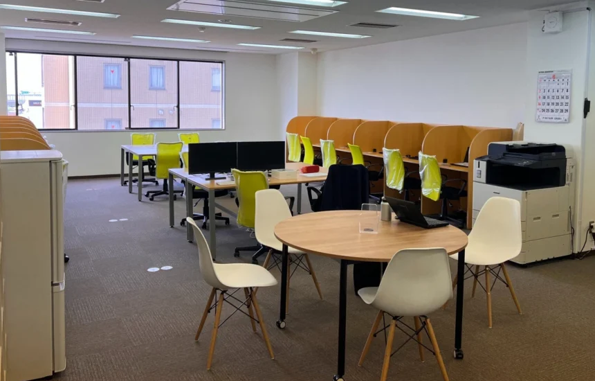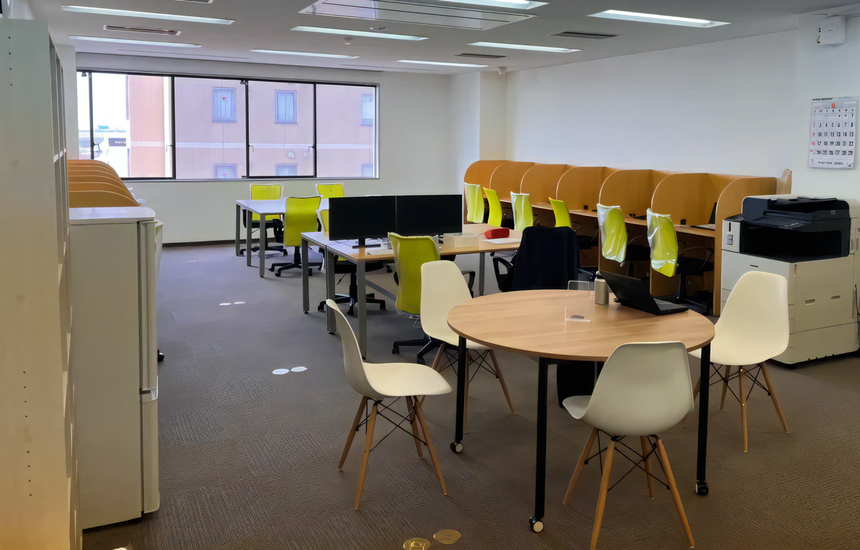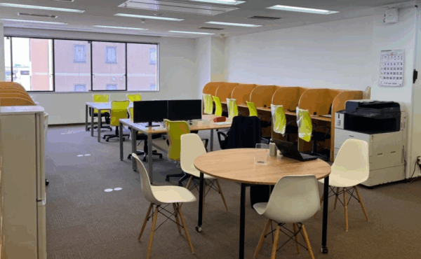 作業スペースは、ゆとりのある広々とした空間が特徴です。作業に必要なPCを完備しており、集中して取り組める仕切り付きの個別ブースもご用意しています。