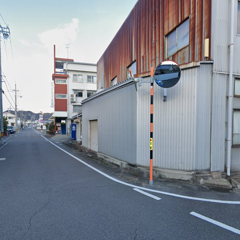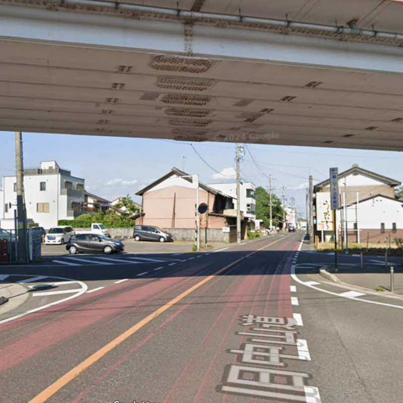 茶所駅の出入り口を右折し、約230m直進します。高架をくぐった先、カーブミラーをはさむ左側の道に入ります。
