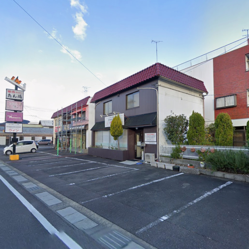 北に約80m直進すると、右手側に事業所が見えます。立ち並ぶ店舗の中で最も右側にある建物が事業所です。